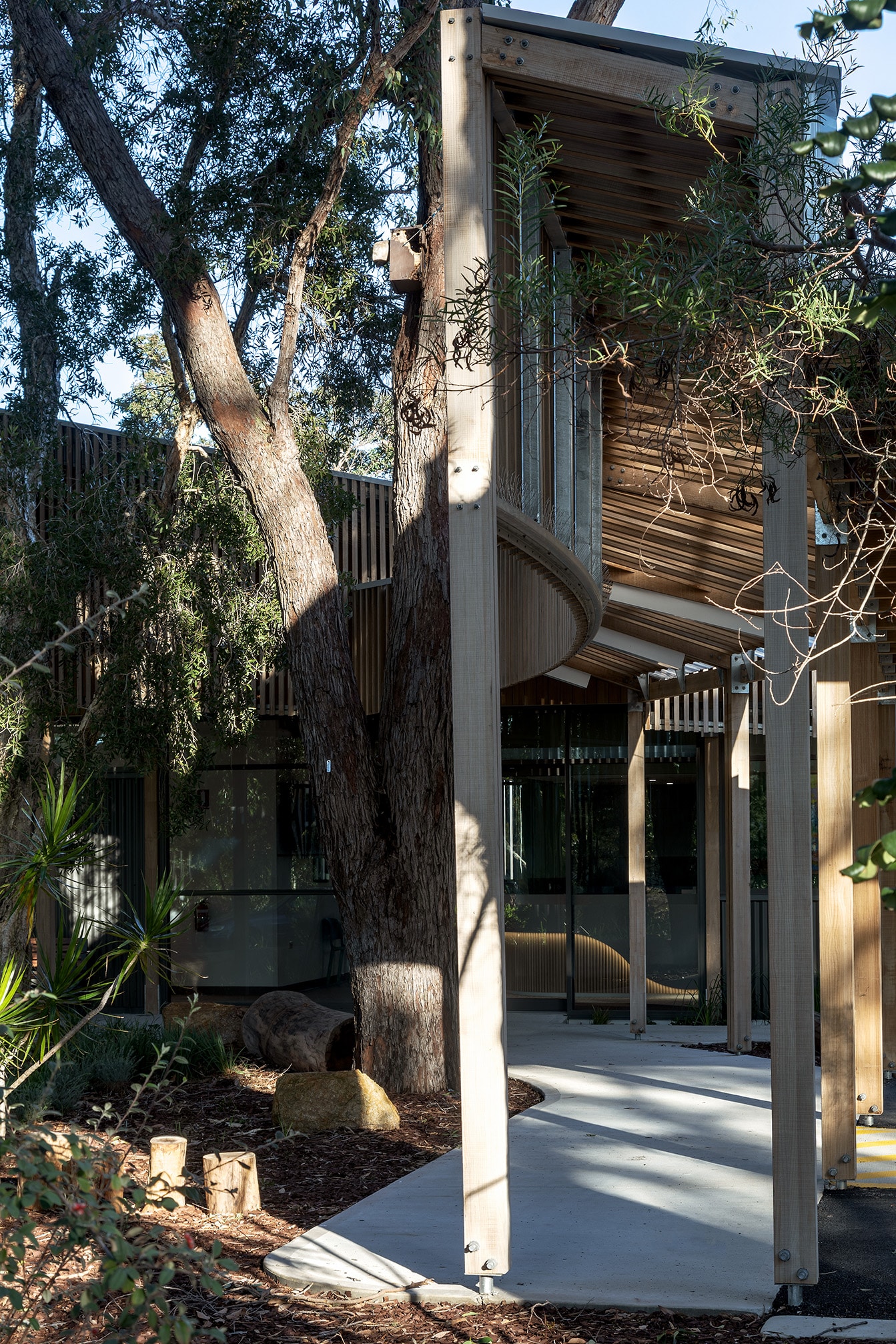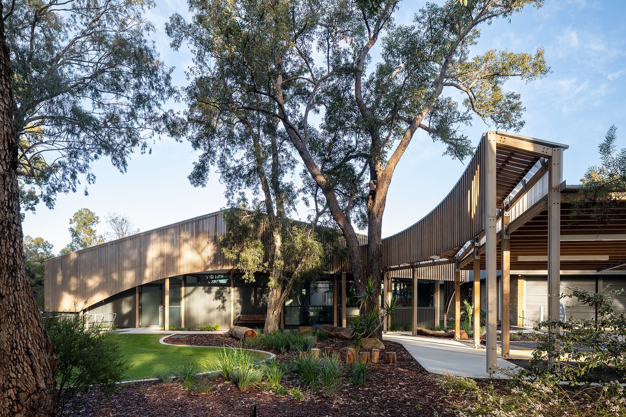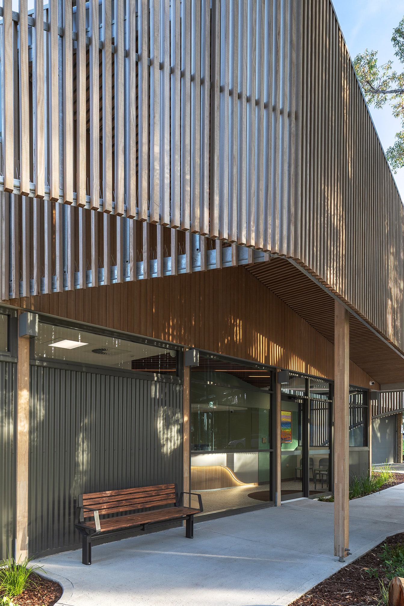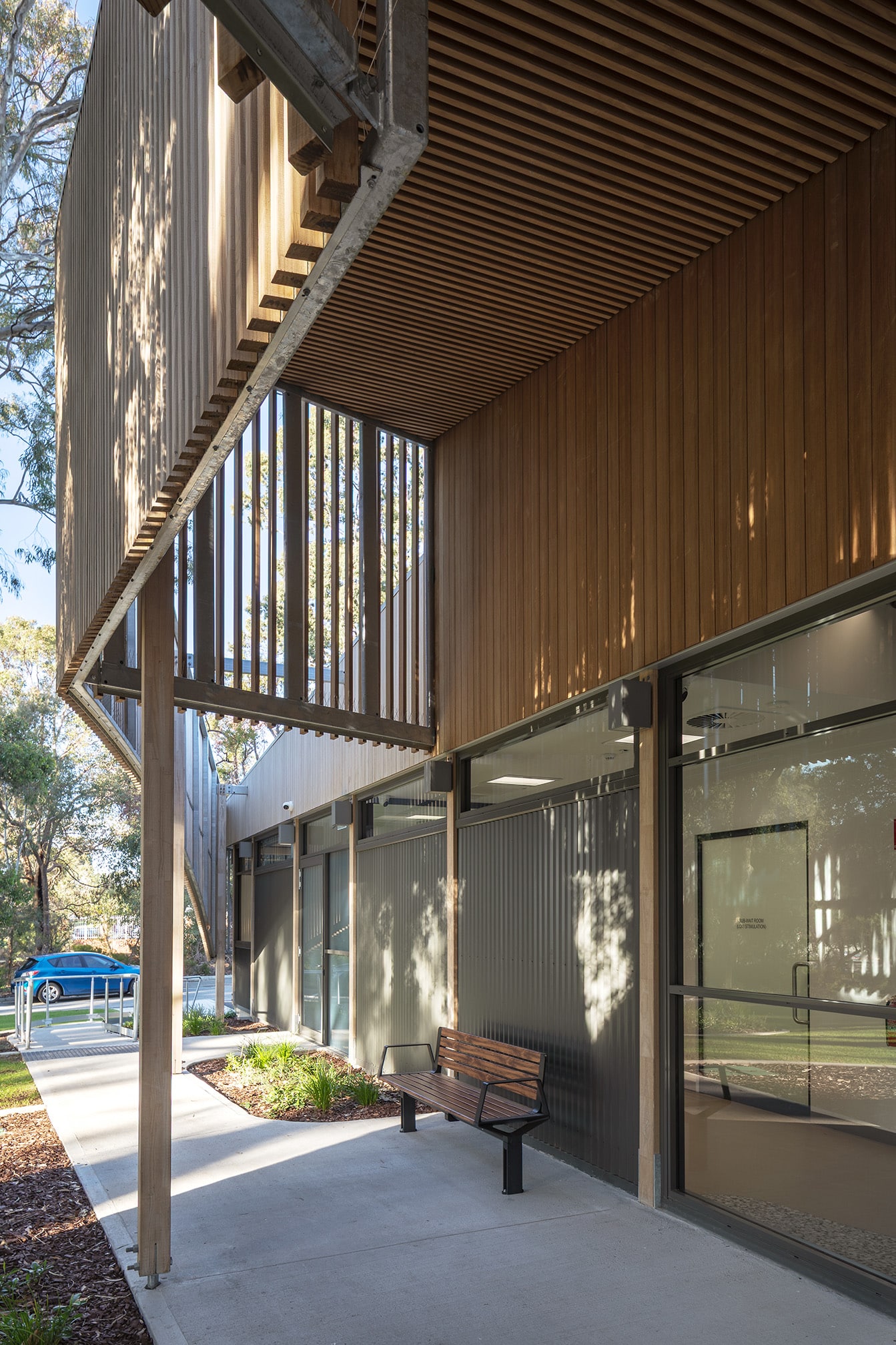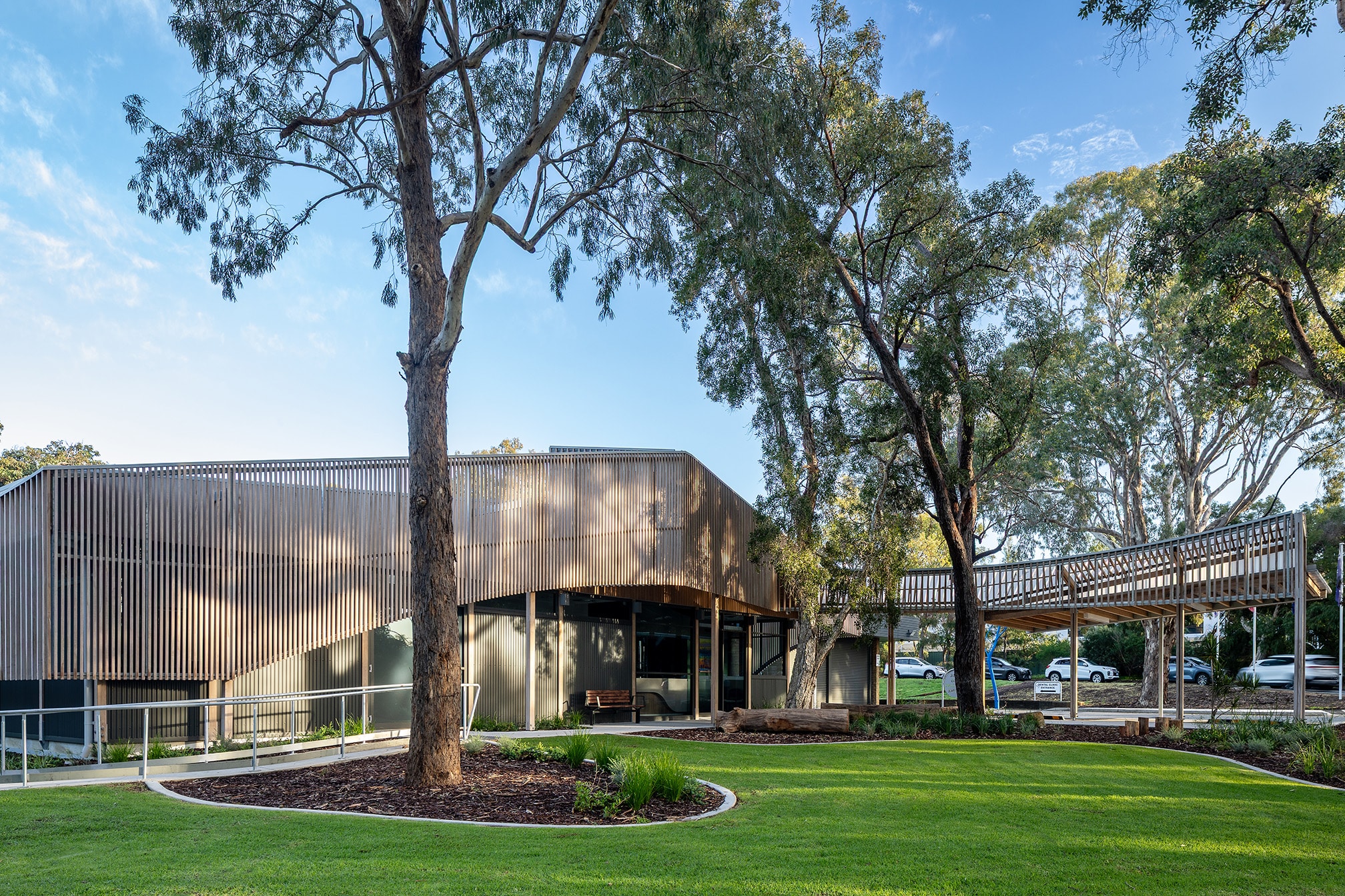 The single-storey facility located in Salter Point is a first of its kind in Western Australia and features specialist dental suites, clinical support areas, and patient-centred waiting spaces, all designed with accessibility, sensitivity, and comfort in mind for the most vulnerable in our community. Externally, striking Vulcan timber batten screens provide both solar shading and visual warmth, giving the building its signature façade while complementing the natural surrounds.